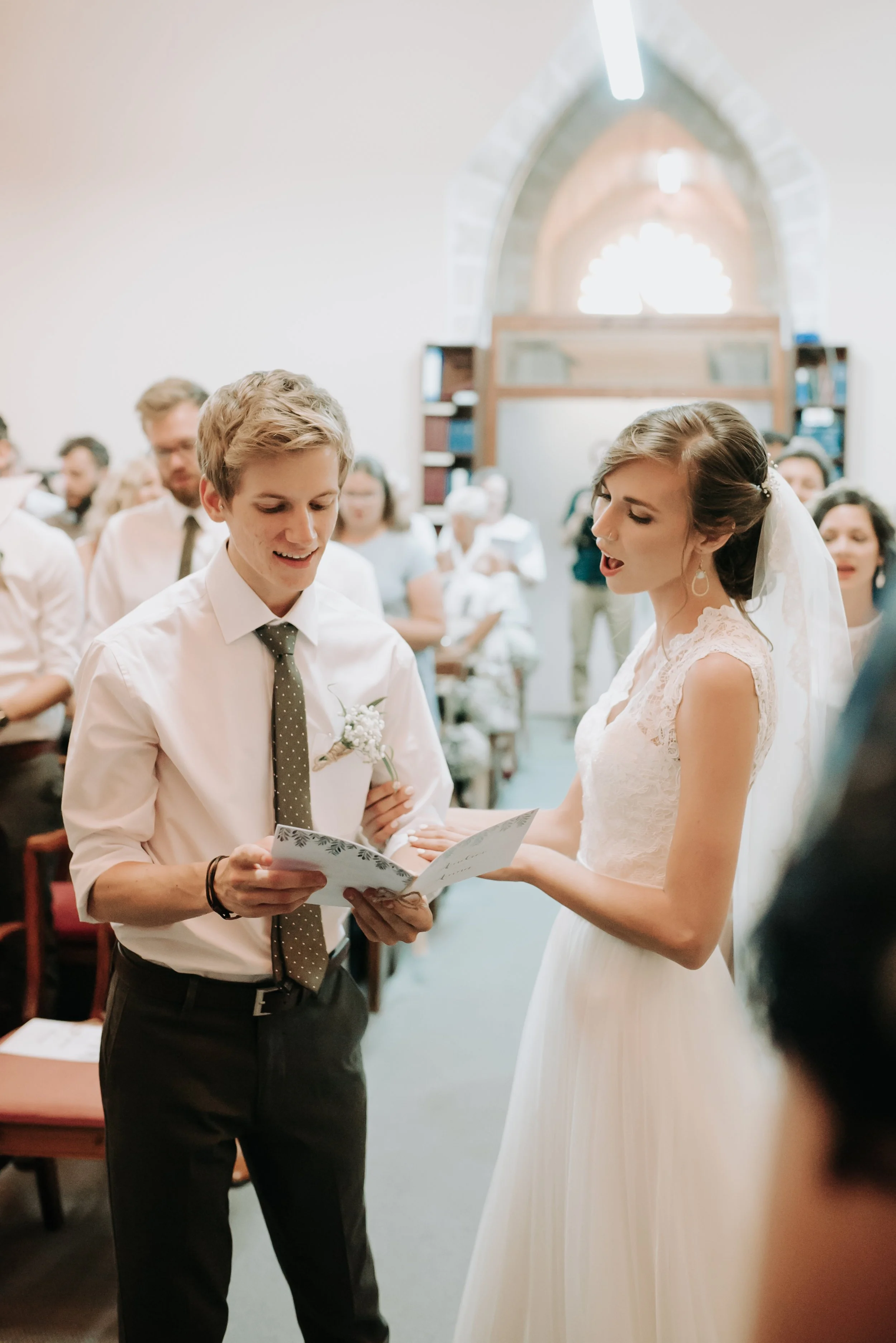 The ceremony took place just a few roads away, at the local church where family and friends awaited the bride & groom. Andrew, dressed to match his groomsmen; wore khaki pants and combining tie. A duet of violin players warmly received the Anna and her father arm-in-arm, while an overwhelming emotion caught the room as the groom spun around to see his bride for the first time.